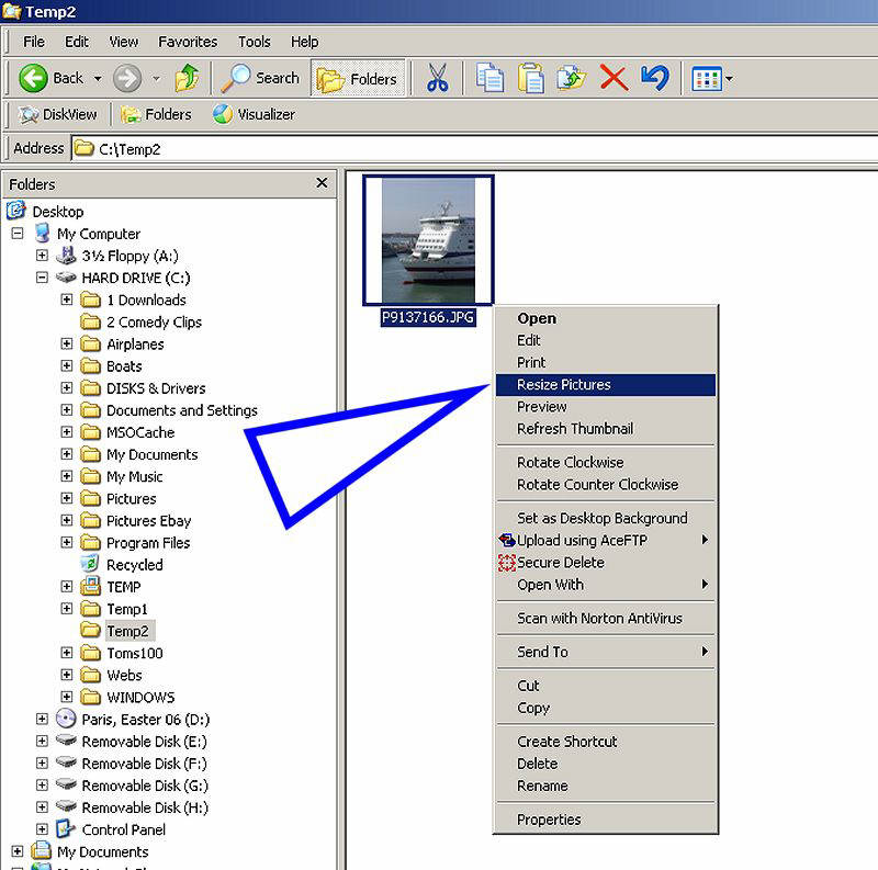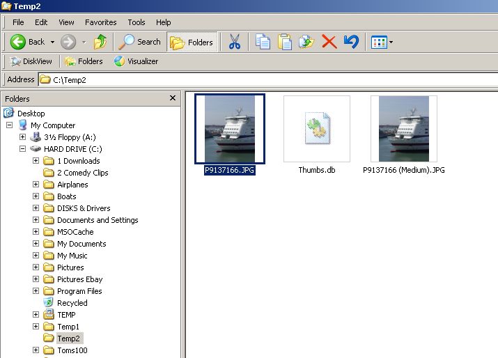 ( First you may need to download the Windows XP 'Power Toy' Image Resizer - http://www.microsoft.com/windowsxp/downloads/powertoys/xppowertoys.mspx ) 1. Open Windows Explorer. ( Windows key + E or Right click my Computer > Explorer or START > All Programs > Accessories > Windows Explorer ) 2. Find your photographs on your computer, in this case C:\Temp2 3. Change to 'Thumbnail view' 4. ( With 'Image