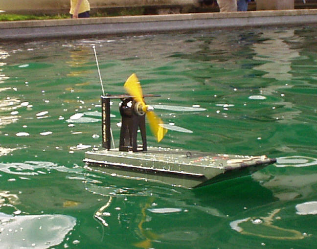 "Swamp Buggy". This has been scratch built from balsa, powered by a 400 motor & 8.4V batteries. It is the creation of Brian Davison (My step dad) & is a firm favourite with the public everywhere he sails it.