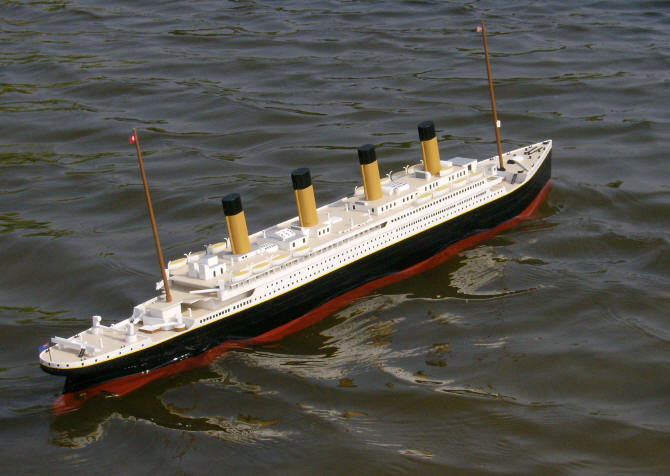 This next is my stand off scale "Titanic". She measures 48 spiffing imperial inches, and is made out of balsa and 1.5mm ply, in what I like to refer to as "The Glyn Guest style" after the chap who writes for model boats making stand-off scale boats with flat bottoms and square sides. I like this method as I don’t have an awful lot of time to do these things, and once its in the water you cant see the bottom anyway! The bit around the stern was the biggest task, as its heavily undercut, as was made with a round stern piece and lots of thin balsa planks and filler. Propulsion is 3x 385 motors at 12v, with three props. As the rudder is central and only bathes in the wash of the centre (smallest) propeller the turning circle is a bit wide and for this reason I only operate in the summer months…….you never know! NB Last picture shows the Titanic and my Island class Royal Navy patrol vessel, just showing why it is best to picture boats on their own and not next to something else of a larger scale! Ashley - Molesey, Surrey