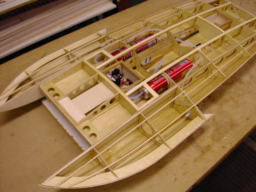 The radio gear sits in front of the engine - weight in front of the C/G - with the rudder servo remote in another box aft, the servo lead running through the black tube seen on the earlier pics.
