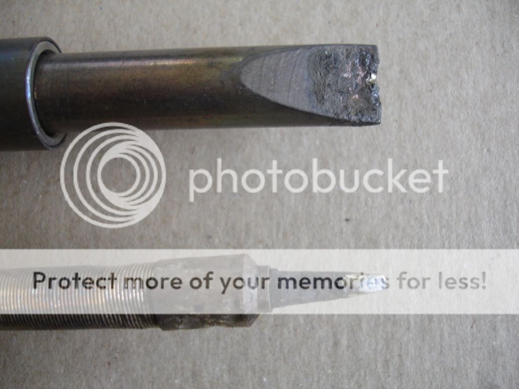 Another important factor is the coating of the bit. In the olden days (I am very old!), bits were of plain copper and the solder etched this away surprisingly quickly. The picture below shows my 120watt un-thermostatted Weller which had a shiny plating when new. It gets very hot and after relatively little use the tip is being eaten into. (But it does solder capacitors onto a motor casing in about two seconds flat!) On the other hand, the lower iron in the picture is my 25watt thermostatted iron, which has an iron coated tip, shows no sign of pitting after at least 25 years of use.