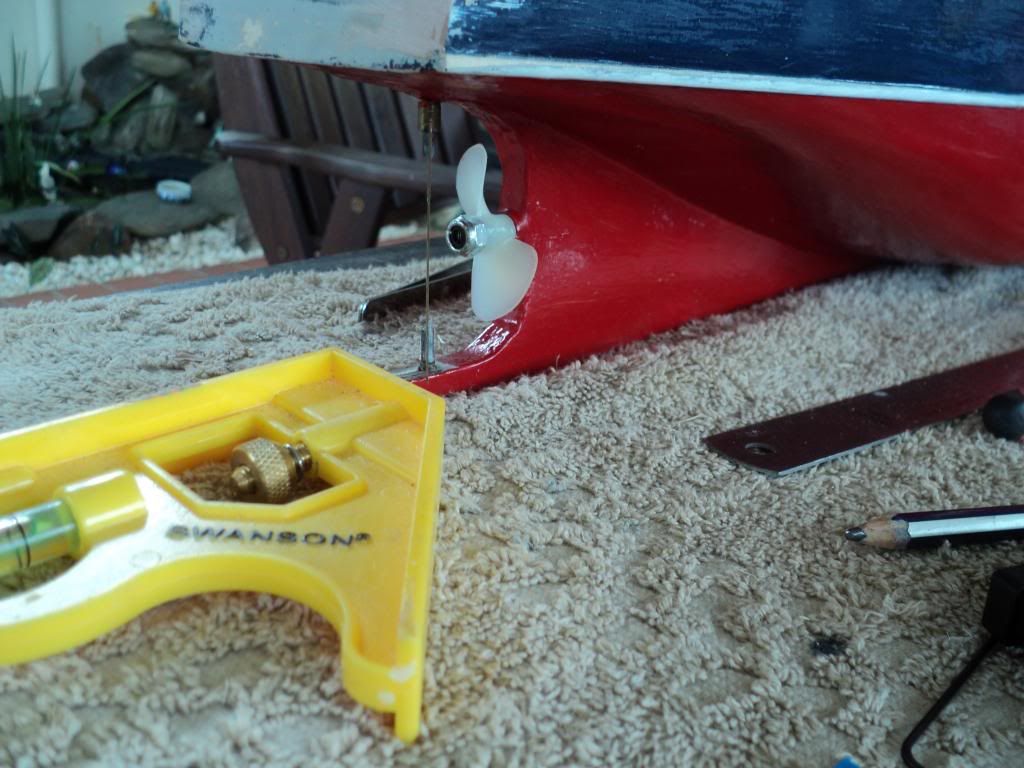 The prop' you have fitted in the picture seems a strange choice, for the kind of hull shown I would go with a very shallow pitch 3 bladed prop, the shallow pitch alleviating some of the paddle wheel effect suffered when in reverse.