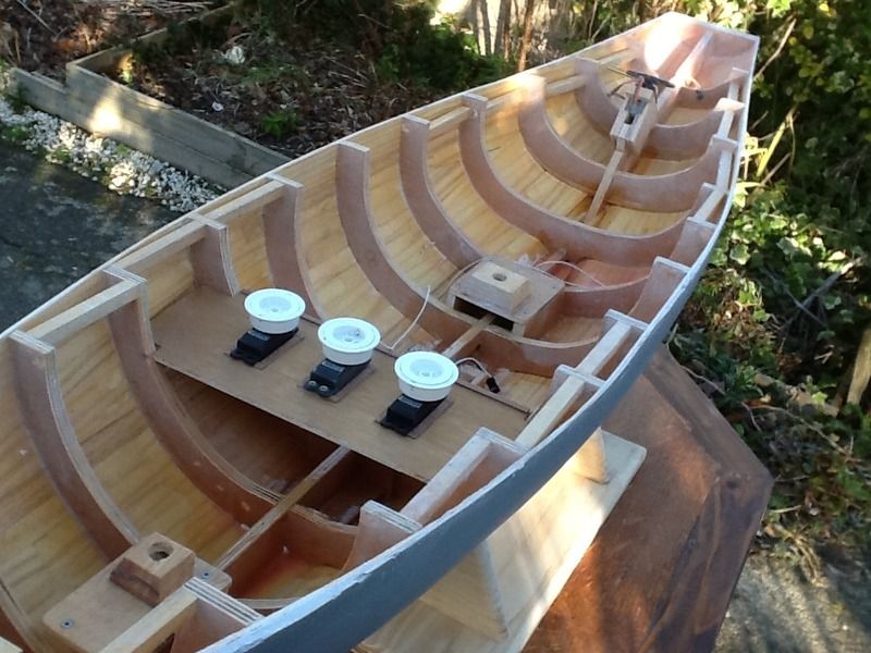 Fwd, inside the hull all resined, a servo tray made one of the pin rails made and the biggest step of all (after a massive learning curve on another thread!) is that I can now control each of the 4 winch servos from one 6v NiMH battery pack and remotely switch on an ESC powered by a lipo should I need to.