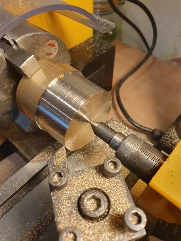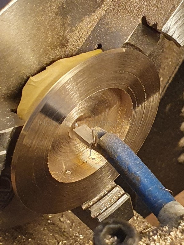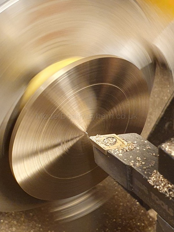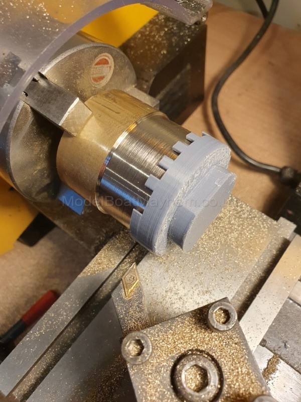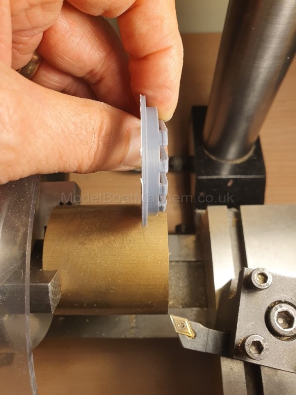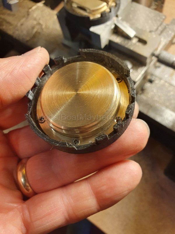 Then the vent reversed (protected with some masking tape), back in the chuck, faced and marked for boring out.