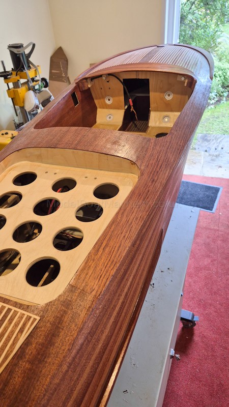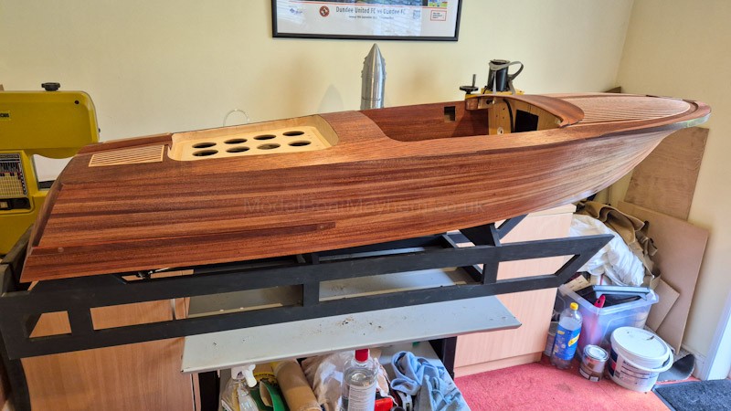It is very thin, and I thinned it a shade (5%) further to improve penetration, and extend curing time, it's now workable for at least an hour, and solid in 24 hours. Brushes on easily and is all absorbed, ideally so there is no 'shine' to the sealer once applied meaning it's all been absorbed. I've since used it on the rear hatch, and the cockpit sides, very pleased with the result. So I've also done a final sanding of the hull and deck ready for a sealing coat in next few days. It's applied once, no overcoating and I'd like to apply it in one session. I've already sealed the planing surface of the hull so the boat will sit in it's stand for application. The epoxy sealer will become the base for varnishing. (I used thinned Z-Poxy Finishing Resin for the 1/10th Aquarama, the Hempel is a lot thinner, and has a longer working time.)